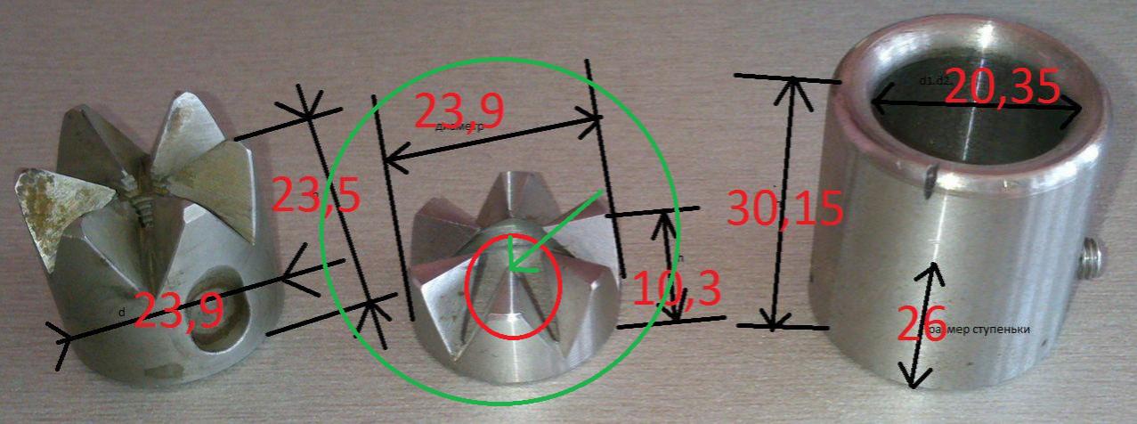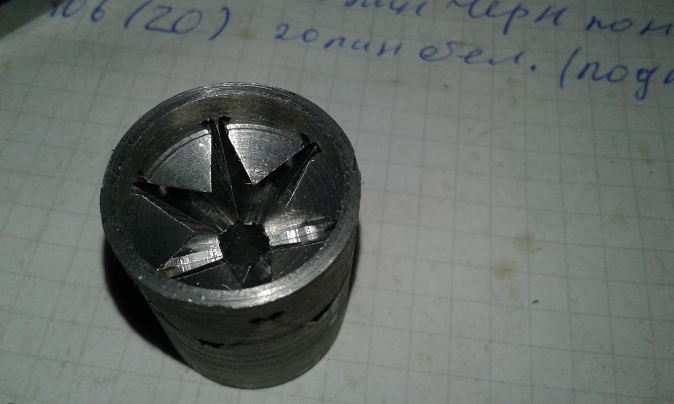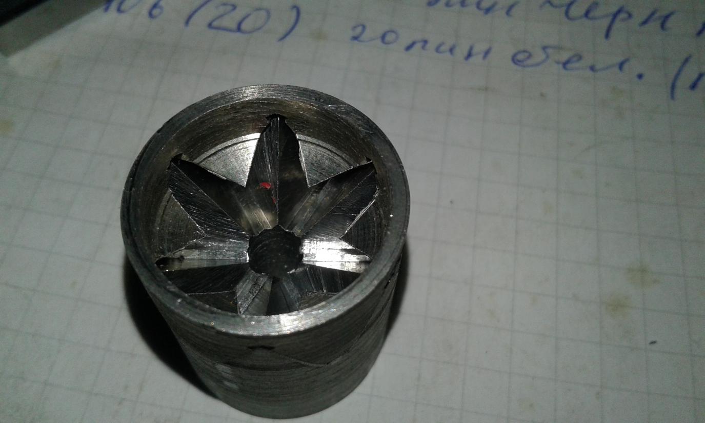 Зубья режутся фрезой под углом в 107-110 град относительно перпендикуляра матрици до центра. Затем, после завершения нарезки зубьев, междузубье торцуется под прямым углом до половины проточки ( 107 - 110 град) относительно центра. Схематично показал. Вторая деталь (коронка), так же режется фрезой под углом 107- 110 град относительно перпендикуляра до центра... |