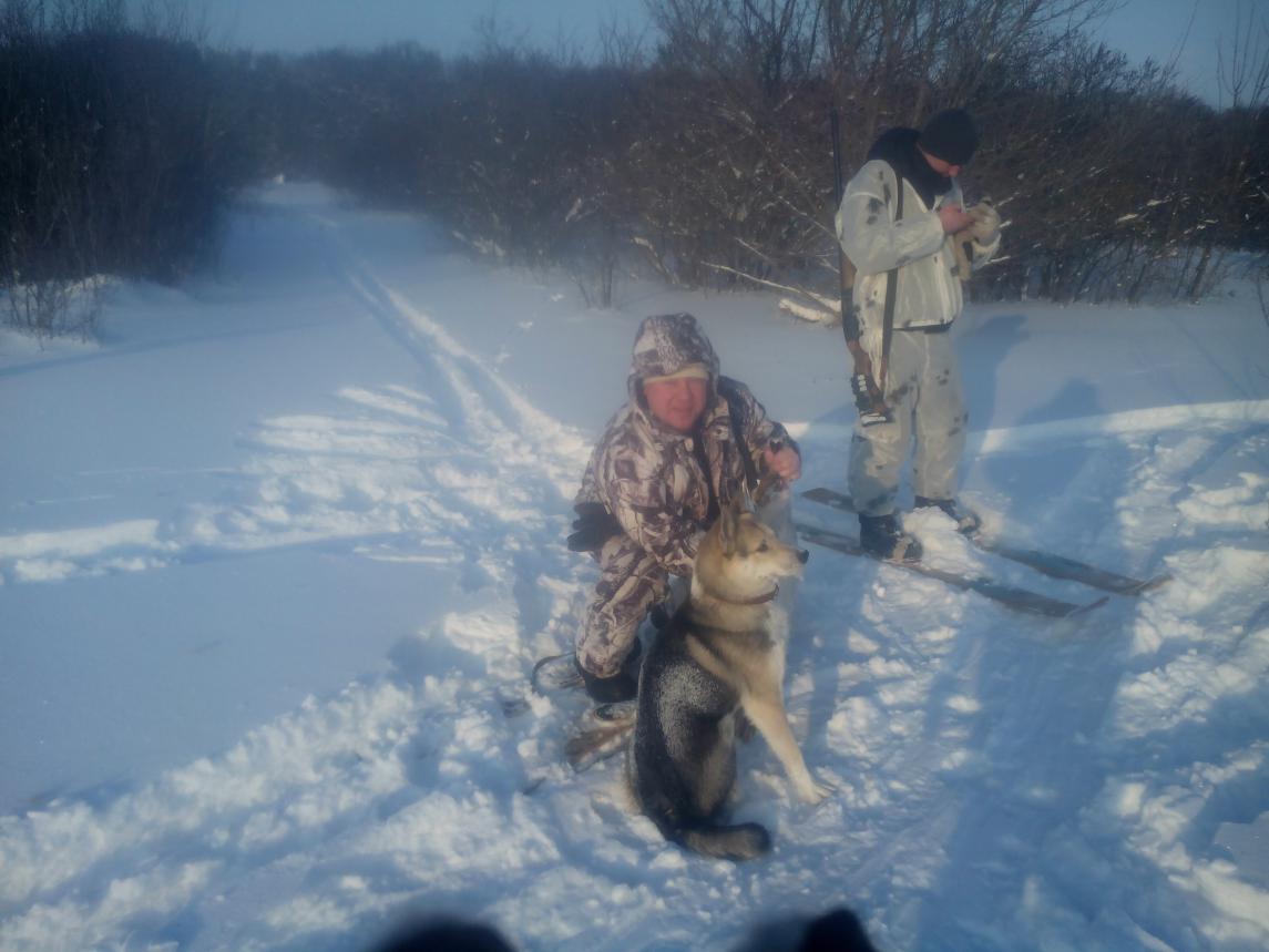 В общем прибыл я в угодья в 8:30. Брат только через час приедет с работы. Ну, а чтобы просто так не тратить время, решил пройтись одну посадочку. Захожу за посадку, и сразу свежий след по лыжне вдоль нее. В субботу тут уже погоняли косых. Ну ладно, иду по следу в надежде, что зая заляжет недалеко. Не тут-то было. Косой прошел всю посадку (2км), вышел на подсолнух и только метров через 500 я увидел первую сдвойку и скидку. Сразу осмотрел поле, ищя накопки. Метрах в 100 замечаю что-то похожее. Держу курс на нее. Подхожу, адреналин бурлит в крови, представляю, как... сейчас... он... выскочит... и... Мля, когда?!! Пусто!:dash1: Кролик не дождался(. Только уходящий след в поле. Надо возвращаться и ехать в запланированное место. В 11 на месте и первая скидка с дороги. Лежал в лесочке. Поднялся и ушел не замещенным. Выжлец на след. Но без голоса. Собаки отказывались работать. Идем примерно в направлении уходящего следа. В начале посадки брат замечает след. Возможно это первый зай скинулся. Я обхожу ее метров на 250. Начинаю переходить и вижу, как косой от меня уходит через подсолнух в дол. Поскольку выжловка грела мне лыжи, пришлось мне вместо нее гнать зайца с голосом.:) И тут ее как прорвало))). Прогнала до переезда , а там косой скинулся в дол в самые дебри. Прибежал выжлец, его на след, а зай вышел с другой стороны и вверх по дороге опять в посадку на круг. А брат уже оттуда ушел. Я на второй круг с кобелем. Брата ставлю на переезд. Решил встать на том месте, где заяц был впервые замечен. А вдруг, обманет выжлеца и вернется своим следом. Стою, жду. Брат в рацию: "х@ярит на меня". Долгие секунды ожидания.... Бах.....Бах....Собака отдала голос. Бах... -Промазал что ли?!!!:mad: Как оказалось первым сильно ранил, косой кувыркнулся и опять в эти дебри. Искали его минут 15-20, и собак туда. Брат обрезал овраг-дальше не ушел. Ну значит здесь. Сам встал на переезд. Смотрю собаки выходят. Брат в зарослях лазит еще. И:prankster: вот он появляется в 5 метрах. Принимаю решение стрелять, чтобы не бегать за ним еще пол дня. Есть!:dance4: Следующего подняли в большом долу, лежал в кустах ветлы. Подпустил метров на 25. Но кусты ему помогли уйти живым и невредимым. Ну ничего, мы еще туда вернемся, чтобы передать ему привет.:declare: -30 градусов - для охотников это не мороз. Погода просто СУПЕР!!! :dance4:Трофей есть, погуляли от души и собачки тоже, чайку попили (1,5 литра мало)! Побольше бы таких дней в жизни каждого охотника! Всем бобра и всех С ПОЛЕМ!:friends: |