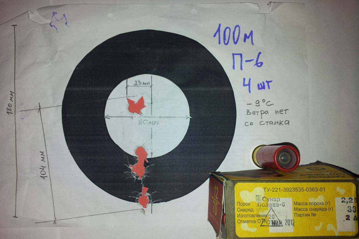 На 50 м. прям хорошо. Даже отлично. А вот на 100... разброс идет почти строго по вертикали. Что не есть хорошо для охоты, т.к. тела животных, как известно, растянуты по горизонтали. Похоже, в начальной скорости постоянства нету. Это как раз те патроны, которые предположительно с бинарной навеской?