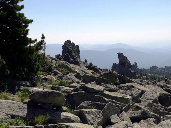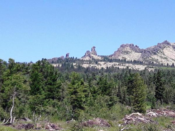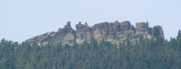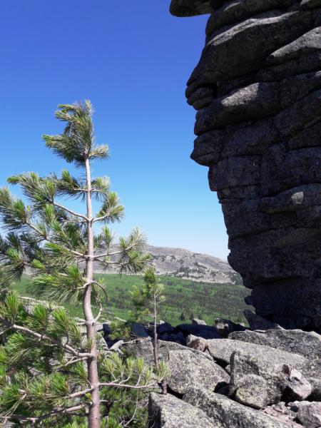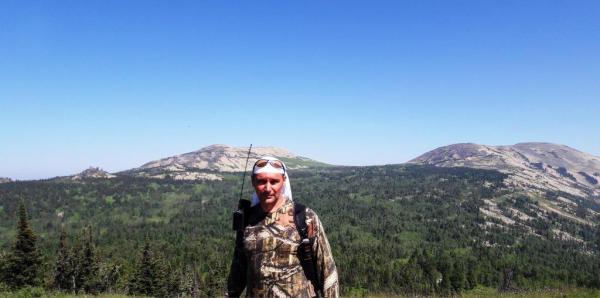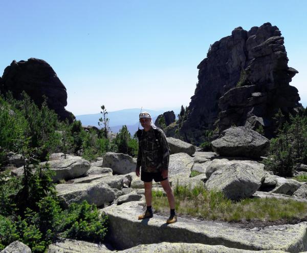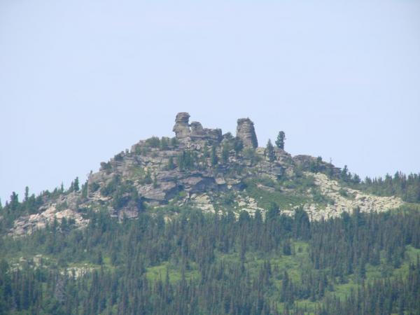 За моей головой г.Курган, 1525м, на ней установлен Поклонный Крест (губернатор Кузбасса Тулеев сделал, а шорский народ очень оскорбился этми, ибо на этих вершинах живут их дужи и эти вершины для них священны. Но это вообще отдельная тема). А справа Мустаг со снежниками. А слева от Курган останцы - величественные и причудные скалы. |