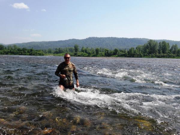 "В Сибири был? Хариуса ловил?"... КАНЕШНО!!! Но в это время весь крупняк уходит в верховья и другую прохладную воду. Вниз начнет скатываться только в конце августа. На крючке подержал, хороший экземпляр, на ультралайт и микро вертушку, но не на этом перекате.И мелкие были, все отпустил. А на этом перекате дальше не отойти, итак еле стоял: мои 95кг унесет как....... Это Кузнецкий Алатау, р.Томь в верхнем течении. |
