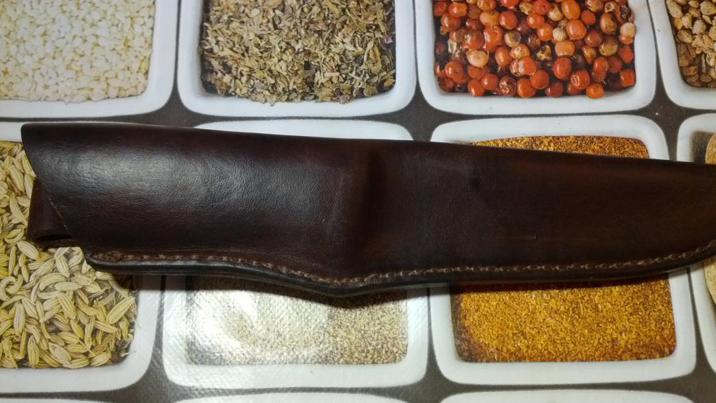 .По ходу дела все было хорошо,но меня не устроил больстр в 3 мм.,сделал второй и спаял их вместе. Потом решил все это припоять на клин,разумеется все поплыло и припой вылез наружу...но думаю это не критично да и более надежно! Нож изначально задумывался без изысков,полировок и т.д.,на фото виден "дятлинг",скорее всего весь больстер будет таким.Ножны заново пропитал,а то как то первоначальный вариант не устроил!!!