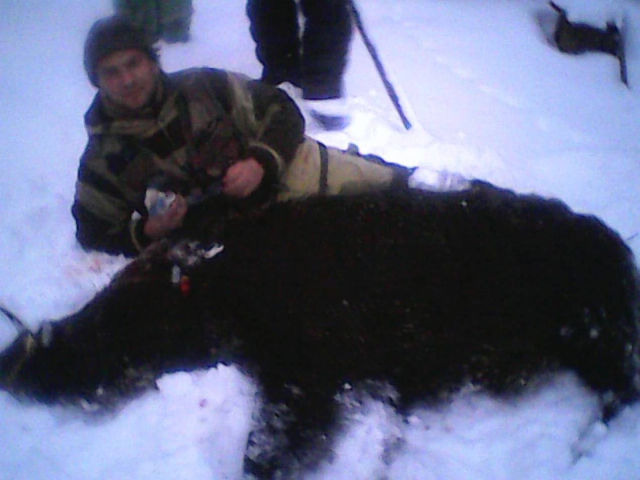 Охотились на взрослого кабана, снега было в это время уже не мало. Дело было под закат дня. "Обрезали" участок крепи камыша вперемешку с кустарником...есть заходные следы...все крупные. Трое охотников встали на наиболее перспективные места отхода зверя, сам ставлю лаек на заходную тропу. Собаки по тропе уходят в камыш, при этом по навигатору отслеживаю передвижение...50 метров...80 метров...120 метров...176 метров и встали...так продолжалось минут 15, ни лая, ни особого передвижения я не наблюдал.Стою жду "команды" от собак для начала подхода, но собаки топтались в районе 5-10 метров, а затем этой же тропой и вернулись, хвосты у обоих поджаты, шерсть дыбом. От злости еле сдержался, что-бы не положить их на месте. Пинками загоняю обратно на тропу и вперед за ними, камышовый тростник высотой не менее трех метров и толщиной с большой палец. Видимость только по тропе(если она не сворачивает), не более 5 метров. Дохожу до точки остановки собак, истоптано все, есть кровь на тропе. По рации сообщаю егерю о возможном подранке. Собаки крутятся по камышу в радиусе 50 метров...мля, при этом ни лая, ни хрена...ничего не понимаю, следы свежак...От егеря получаю по рации цу: в связи с сгущающимися сумерками взять направление на "завершение охоты" на сегодня и потихоньку выходить...и я двинулся своим-же следом в обратку. Собаки рванули по тропе вперед меня и встали метрах в 20 по тропе..подхожу...обе стоят, шерсть дыбом, верхом втягивают воздух. Даю команду, пинком под зад, кабелю вперед. Метров через 10 камышовой целены, натыкаюсь на одиночный след... Кабель проходит метров 7 по следу и встает на повороте, шерсть как у ежа ключки. Смотрю в направлении повернутого носа кобеля и....вот он метрах в 5 от меня. Проблема в густом камыше, вижу силуэт, но не понятно где башка... где жопа ( с этого момента все развивается молниеносно). Право лево, лево право и бью в район головы, с такого расстояния не возможно промазать, и я не промазал...попал...только попал не в район головы, а в район жопы, а именно в правую ляжку. Как потом выяснилось, при разделке, эта пуля отсекла в районе тазобедренного сустава правое заднее копыто, прошла над яйцами и вышла на вылет через мягкие ткани левой ляхи... Кабан издает какой-то не свойственный звук, вроде как заваливается, я теряю его из вида, при этом боковым зрением замечаю, что мой кабель как-то неестественно летит с тропы в камыш. Понимаю, что его поддевает кабан, быстро разворачиваю ствол на тропу, при этом понимаю, что этой махине необходимо уступить "дорогу". Шагаю назад, пытаясь уйти в сторону с тропы...цепляюсь ногой за камыш и начинаю заваливаться на спину...в падении бью со второго ствола в голову кабана....он падает мне под ноги. На сколько возможно резко вскакиваю, при этом(даже не помню как) перезаряжаю двудулку...вскидываю, но стрелять не могу...кабель на туше делает эпиляцию в районе жопы, сука в районе головы. Кабан при этом не движется, но дышит и шерсть на загривке дыбом...пинком сбиваю суку с кабана и бью ему в район уха при этом кабан делает рывок метра на полтора вперед, бью еще раз и ....фенита ля комедия... Вчетвером еле погрузили в машину... Конечно и до этого были выпады кабанов в мою сторону, но на такой ограниченной в плане обзора и маневра территории, в первый раз. Адреналина хапнул в достатке, при чем минут через 30...))) Пардон за качество фото, фотоаппарат с собой не