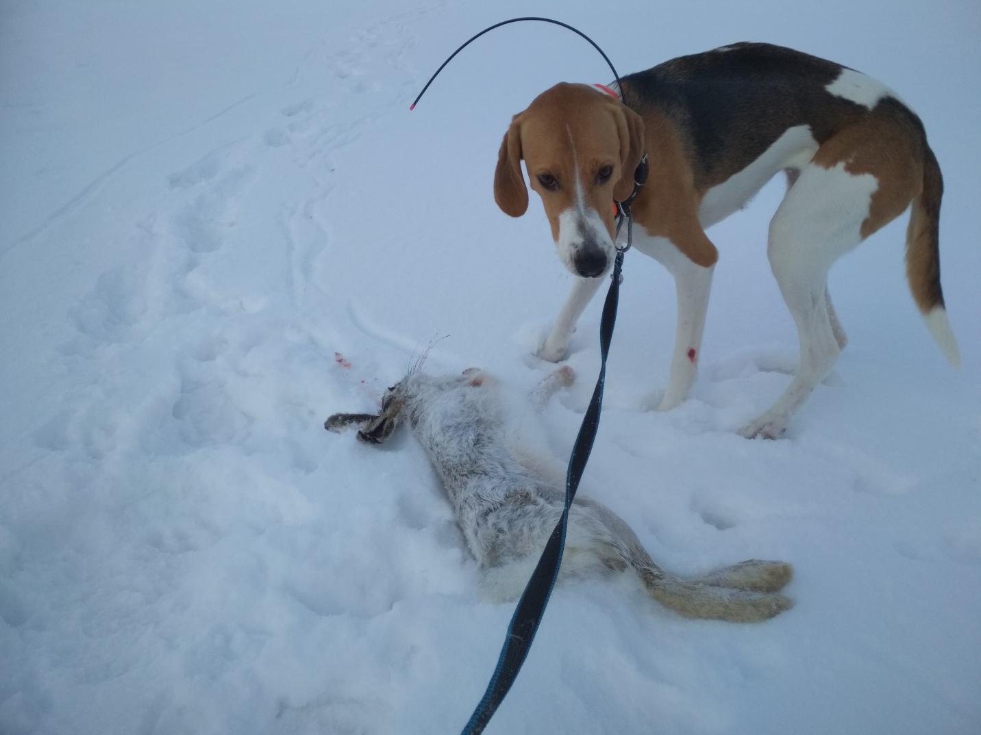 Погодка вроде бы нормализовалась да и дома сидеть как то не хочется.Утром посовещавшись с выжловкой рванули в угодья.Следов было полно но зайца не как не удаволось поднять.Решено было сходить к профессору который нас егорил не один день.Косой оказался на томже месте встал заранее не дожидался.Выжловочка натекла и повела .Час заяц дурил нас двоих не повторяясь выбирая все новые лазы.Но всеже он допустил ошибочку и я памятуя о прошедших не удачах занял позицию хоть и не удобную но как оказалось правильную.Русачок по манере хода мне очень напомнил белячка.Жалко было мудреный заяц но удача в этот день была не на его стороне.
