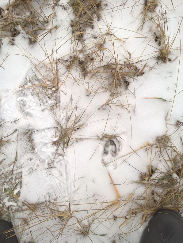 Всё рыбалка и рыбалка-надоело.Тем более,что все равно весь улов отпускаем.После долгого перерыва выбрались с товарищем на охоту,поискать степана.С погодой как обычно не повезло,но уж если приехали будем охотиться.В одно место заехали-нет следов совсем.Переехали в другое, там решили немного походить.Через некоторое время я отвлекся,глядь-а приятеля нет нигде,хотя был неподалёку-разбирался в чьих-то следах.Пригляделся повнимательнее - вижу он стоит и смотрит не отрываясь в ивовые заросли метрах в тридцати.Подхожу и тут в зарослях вскакивает какой-то зверь и начинает удирать от нас через густую траву.Я не разглядел его толком,но только видно что это не лиса.Зверь пробежал в десяти метрах от оставленной нами машины и помчался дальше,только следы на память оставил.Тем временем чуть дальше из кустов вылетает ещё один,потом ещё и ещё.Лицензии у нас нет, поэтому я и не собирался стрелять.А вот товарищ мой всерьёз расстроился,обиделся на меня и ходить после случившегося больше не захотел-запросился в машину. Значит пора домой,да ещё как-то сразу повалил снег. Потропить зайца так и не получилось.