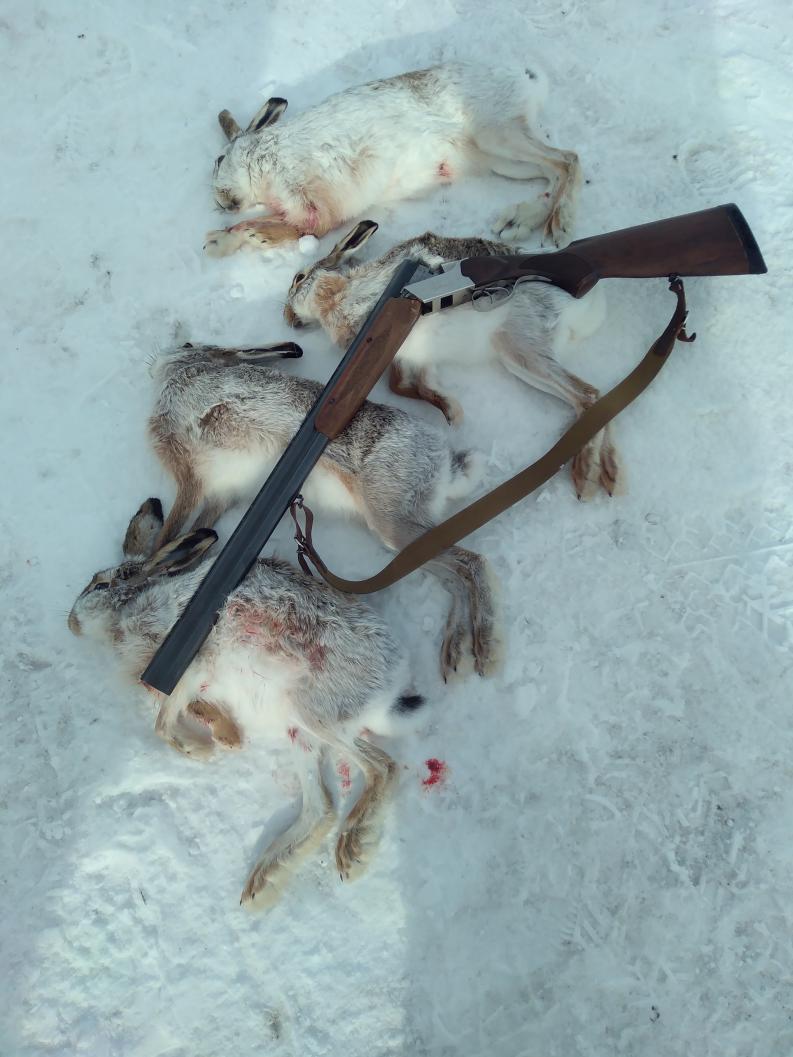 Немного отчитаюсь о прошедшей охоте. Долго гадали в какой из 2х выходных ехать, выбор пал на воскресенье. Охотились в знакомых местах, в команде из 6 человек. Первый загон, я на номере, вышел на напарника и был чисто взят. Далее пошли в сторону лесопосадки, которая нам показалась перспективной. Подождали пока переместятся стрелки и пошли. Пока шли, впереди замечаем свежий след, сдвойка в районе овражка, дальше следа нет. Быстро рассредоточились, зай все почувствовал, но ...поздно . был взят метким выстрелом охотника. Вобщем дотопали до посадки , начинаем гнать, подняли степана, выстрел-подранок, уходит . Нам что сделать, за ним по сугробам и кустам. Далее все очень долго, пока шли за подранком, поднимали еще. На ходу меняли маршрут относительно недобранного и только поднявшихся. Подранок добран. Дальше взяли еще одного. В общем интересная динамичная охота. Решаем передохнуть, пока шли- след. сработал инстинкт- Напарник в овраг , зай поднялся и ушел вверх на посадку. Ну что ж, идем обходить. Опять подранок, силы уже на исходе, день к концу. Попытались идти по следу, но увы и ах... ушел. Расстроены. Решаем собираться в сторону дома и слышим одинокий (надеюсь меткий ) выстрел. Подумали что одинокий охотник не дал нам согрешить и добрал подранка. К сожалению моя охота была без единого выстрела, постоянно в загоне. Но надеюсь не зря я бегал на лыжах по липкому снегу и лазил по глубоким оврагам. Хочется верить что не зря...