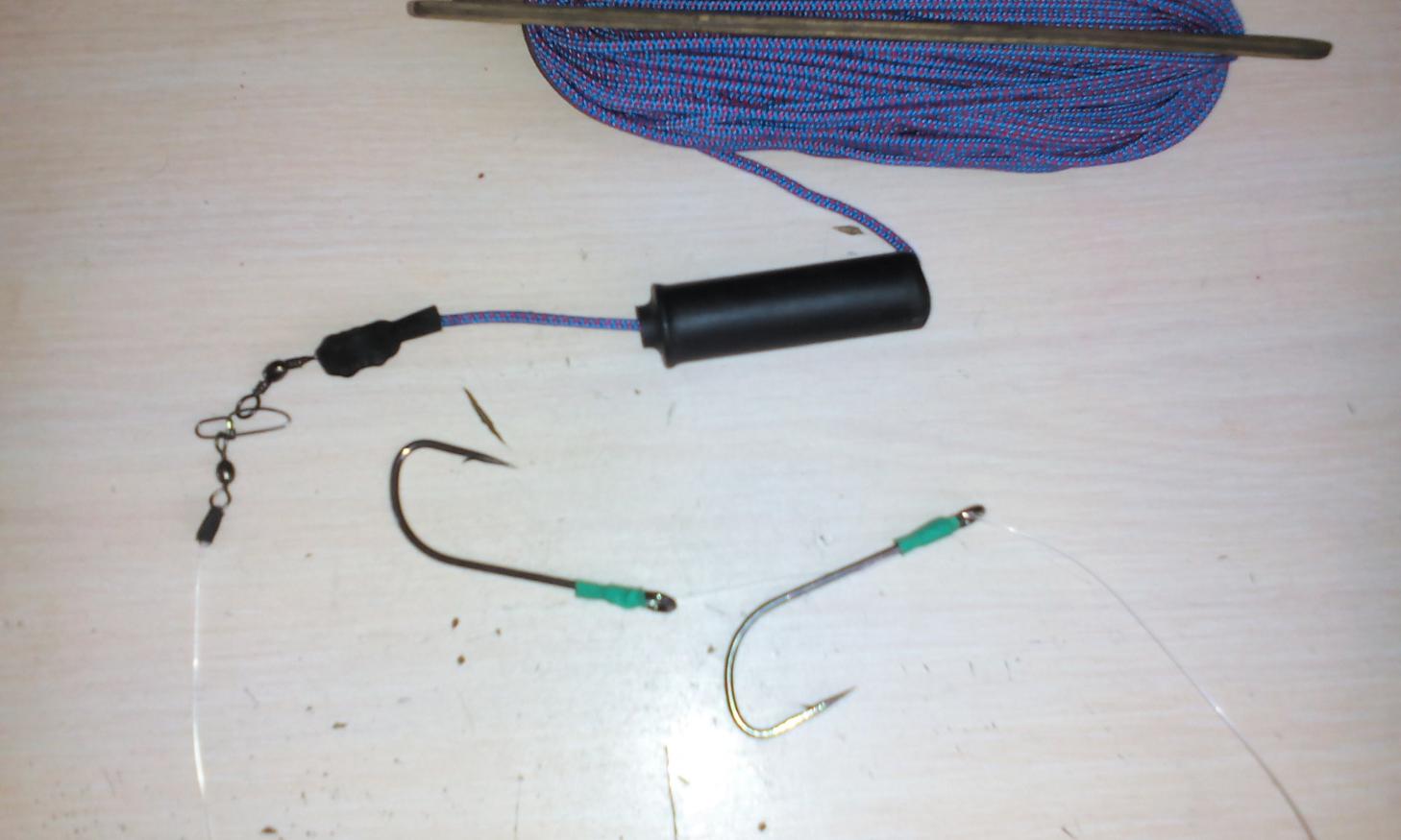 Далее эшафотным узлом был присоединён вертлюг, карабин и поводок с крючками.