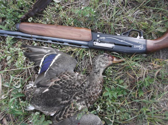 Сегодня часов в 12 мотанулся за Самарку песка набрать несколько вёдер. Ну и конечно ружьё прихватил, что бы проверить рядом находящиеся лужи. Кидаю камень через кусты и слышу шум крыльев.Вылетает тройка крякашей метрах в 40. Выстрел по крайней - МИМО. От выстрела взлетает ещё пара. Бью в последнюю и она камнем падает в камыш. Несусь туда и нахожу трофей в метре от берега. Даже мой баллон не понадобился. Выстрел оказался снайперским. Одна дробина под крыло в печень, вторая прямо в глаз. Утя померла сразу. Вот такой приятный бонус в обед.