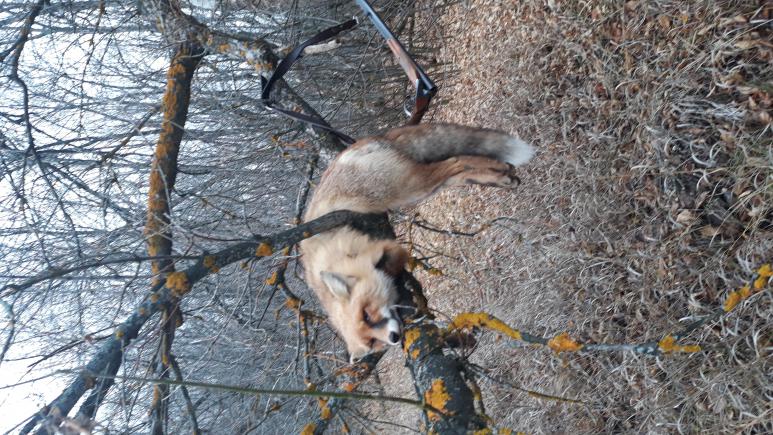 Потерял, пока переходили овраг, слышим опять гоняет. Встали на лазу, слышу гон приближается, приготовился, жду. Минут через 10 наглая рыжая морда выходит прямо на меня в лоб, стрелял двойкой, лис начал от меня уходить вверх по оврагу, выбегаю на верх, вот он идет к посадке аккурат бочком ко мне, Главпатрон единичка положила его на месте. Хороший лисовин.