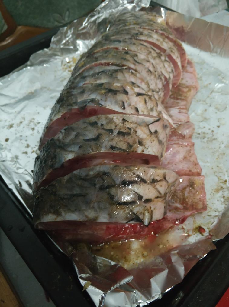 Сазана привезли к НГ друзья, угостили! Решил особенное изобразить, т.к. рыбина была большая, килограмма 3-4. Голова и хвост с плавниками в уху. Икру приготовил по простому (вычитал) - обжарил с яйцом куриным, укропом и солью с перцем и на бутерброды! Сазана же напичкал специальным составом - рис с грибами (отварить/обжарить), на 40 минут в духовку вместе с рыбой! Ум отЪешь!!!
