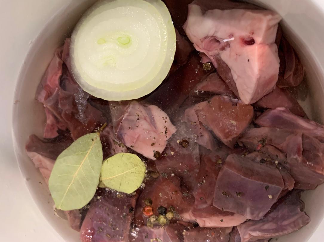 1. Отвариваем сердце – минут 20 после закипания (соль, лук, перчик и лаврушка).