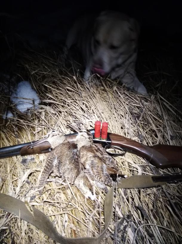 во время открыли. и погода под стать. вчера сил не хватило после работы ехать. а сегодня пораньше в деревню приехал. пока то, да сё, в пятом часу пошел не спеша к заветной полянке на краю леса. на зады только вышел, кобель по большой нужде сел, а я смотрю куропатки пара выбежали на дорогу и бегут)) одна вправо нырнула в траву, а вторая бежит дальше. кобель увидел, скулит)) вроде дернулся бежать, а дело то не доделал)) и так вот полусидя припустился, на ходу @овно теряя)) да с лаем)) иду и думаю- зимой заяц, если дорогу перебежит, пока едешь на охоту, то считай можно разворачиваться, а тут куры... дикие. а красота ж вокруг, снега мало уже, весна. в сосняк захожу и опа, сапог полон снега. ладно, пролез до полянки. в этом году деревья еще выше стали. а там зима. снег вокруг.. простоял я там до начала сумерек-тишина. а смотрю по кобелю-слышит ведь что то. решил вернуться на поляну перед сосняком, где снега нет. а там лёт уж вовсю. первого почти в ноги уронил. подранок. лабрик с живой птицей оторопел на полминуты, видимо соображал что с ней делать. аккуратно взять-она не дается, а ломать вроде как порода не позволяет)) но поймал в итоге. а второго уже в темноте взял. небо то еще более менее светлое было, увидел.