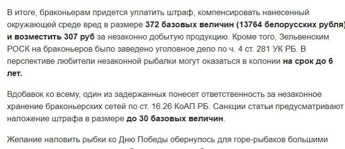 Нужно перенимать опыт соседей, кому не в лом, посмотрите белорусские новости . Особенно на штрафы и сроки внимание обратите. Сейчас у них нерестовый запрет, за 10 кг рыбы вполне можно присесть на 6 лет в колонию. Ну а чтобы штрафы оплатить и причененный природе ущерб придется машину продать, а то и дом. Самое интересное, полностью запретили оборот китайских сетей и хранение. Нашли дома сеть - 30 базовых, на наши почти 30 тыс. получается. Если на озере с сетью попался - дома обыск. Во время нереста заняты все, не только рыбнадзор работает, но и участковые, гаишники и т.д. Вот это подход! У меня тесть в Беларуси живет, говорил что браков сейчас как вид истребляют. Увидел, на телефон, инспекция реагирует мгновенно. Приезжают с омоном и упаковывают. Было бы у нас так, паразиты бы тоже перевелись. |