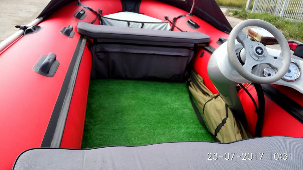 Полы, морская фанера. Выпуск лодки - 04.2015, покупка - 08.2015, спуск на воду - 05.2016, общее время на воде - 27 м/часов. Комплектация всё, что идёт по паспорту + Носовой тент, носовая сумка, дополнительные широкие банки с мягкими накладками, коврик, БРОНЬ ВСЕГО ДНИЩА !!!. Есть одна латка, в носу, внутри, на фото обведено белым кружком. Состояние отличное. Цена: 78000. Причина продажи - переход на пластик.