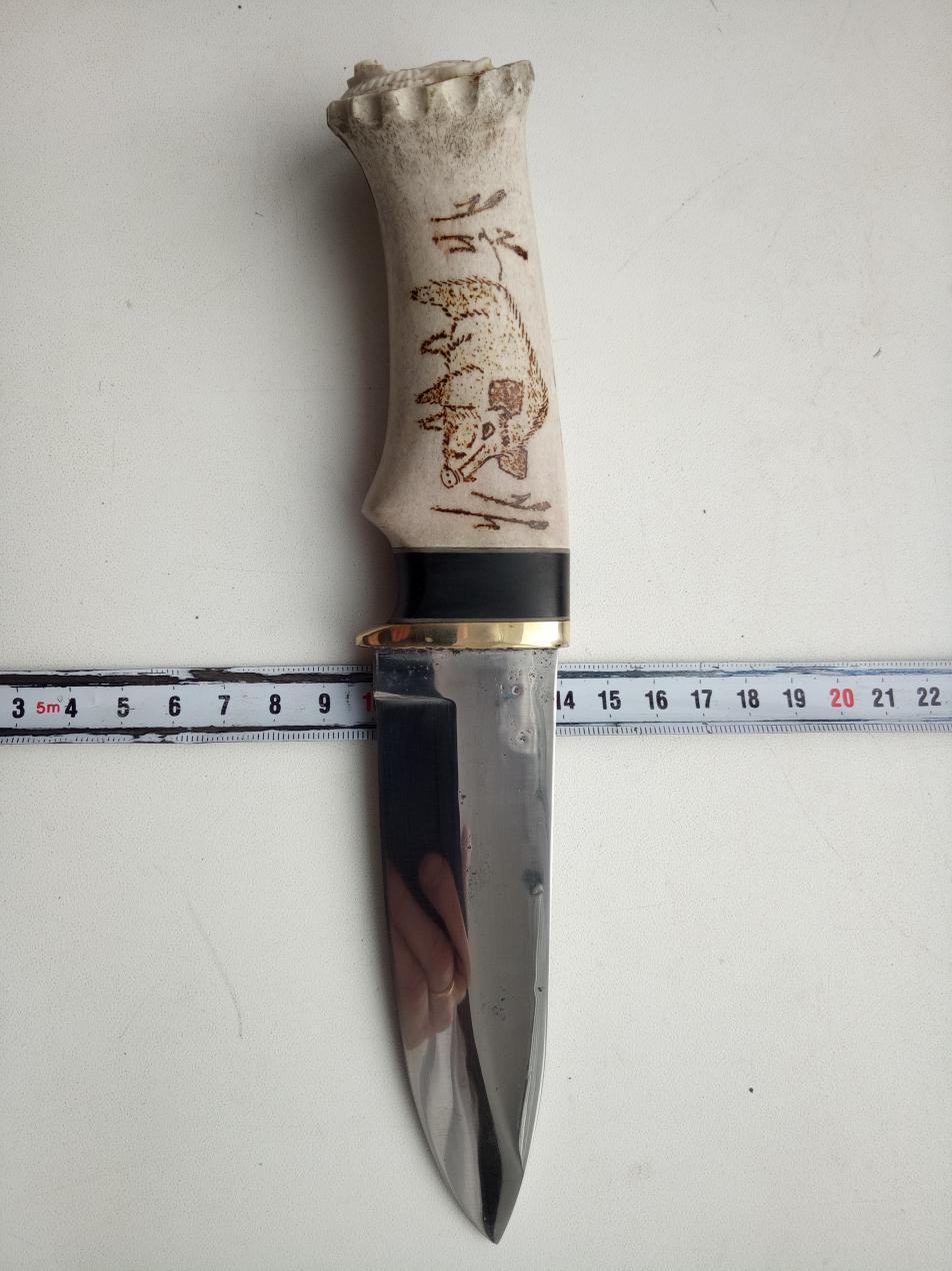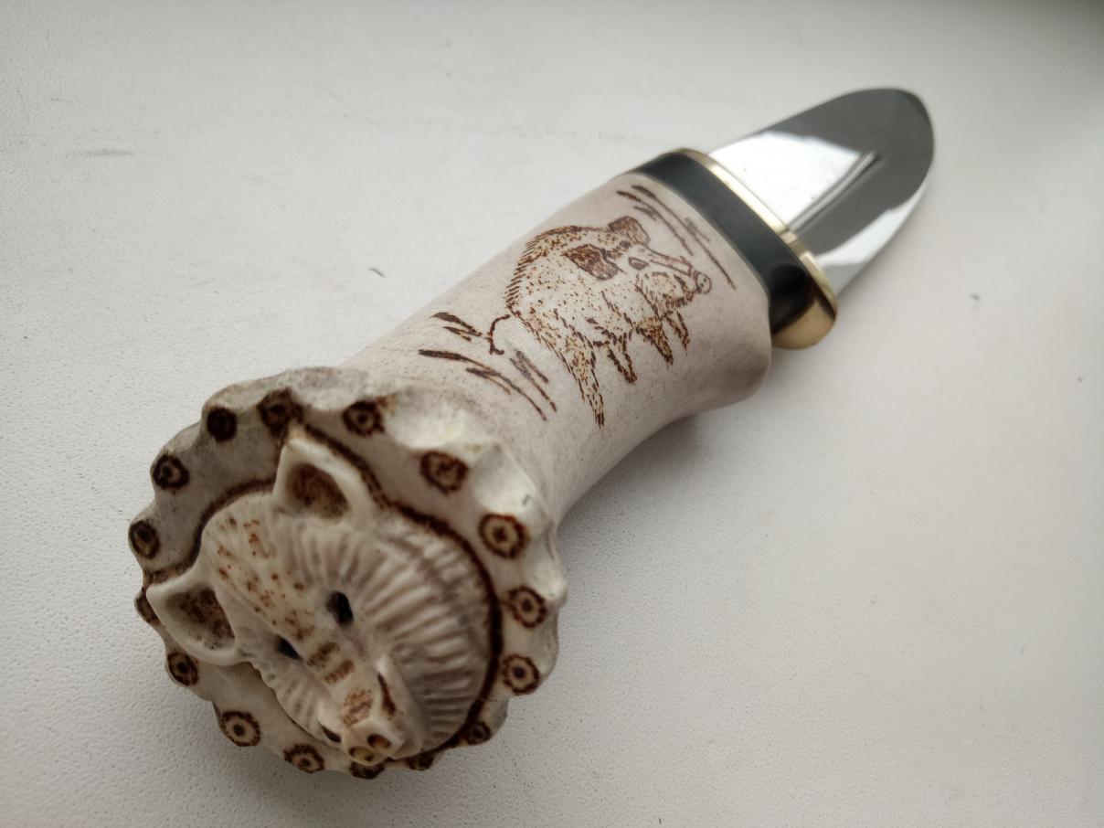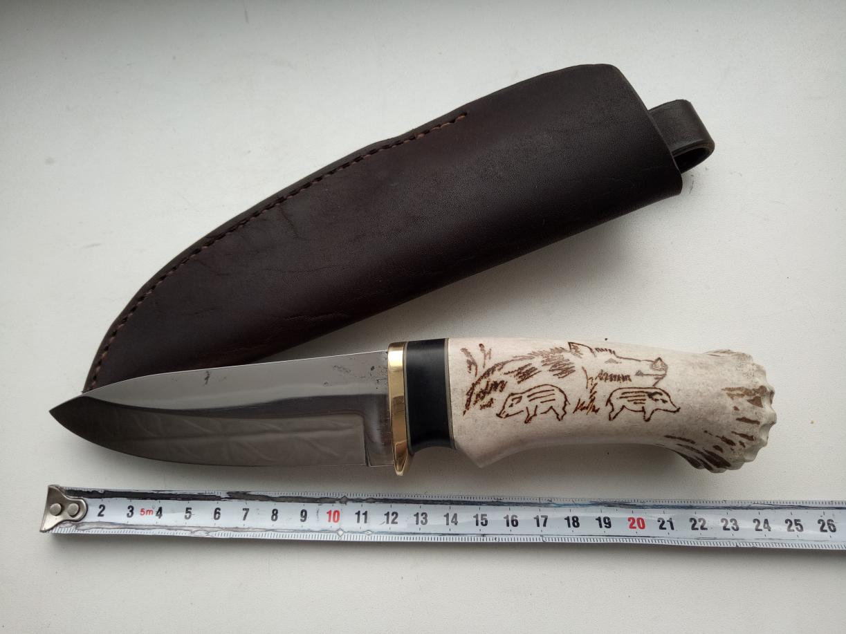 Рукоять: Рог лося с резьбой головы кабана на тыльнике и пирографией на рукояти. Проставка - африканское черное дерево (african blackwood) - Dalbergia melanoxylon.