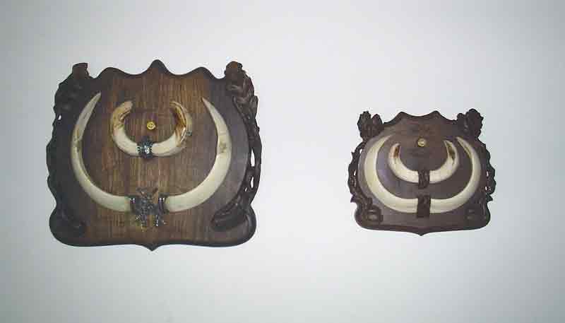 - сварить - извлечь - обезжирить - покрыть защитной пленкой, чтобы не трескались - залить пустоту ................ Это сохранение оно стоит $ 100. Если привезете свой медальон, укреплю бесплатно и трофей готов .. Не дорогие медальоны можно сделать самому или заказать в любой cтолярке, цена примерно 300-500руб. Некоторые заказывают сразу 10-20 шт. и крепят все подряд клыки, а для самых крупных и красивых делают медальоны резные из ореха. Резьбой у меня занимается отец, он вырежет любой медальон и посоветует эскиз, цена зависит от сложности. Оформить на простой или резной медальон решать Вам, в любом случае - Это ВАША память об охоте, которую не вернешь.. Кто бывал на охоте в Европе видел оформление замков ((фото Чехия, музей охоты)) Доставить мне можно всю голову, отрубить под уши, или срезать лишне, как на фото с телефоном. ((( Клыки нижние примерно 70% находятся в челюсти, рубить нужно - МЕЖДУ ГЛАЗОМ И ЗУБОМ ))) при срубке, в рот поперек засунуть палку, чтобы зубы не сломались друг о друга... удачной охоты.... Последний раз редактировалось StuDent; 24.01.2012 в 10:50. |