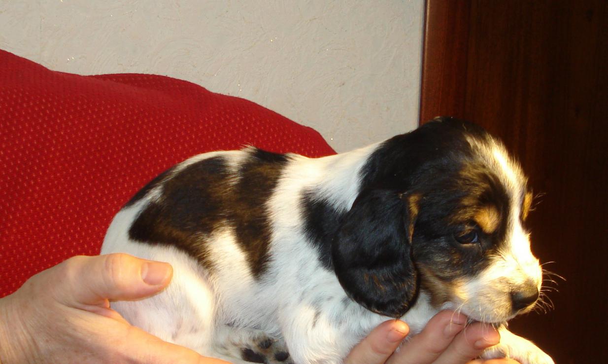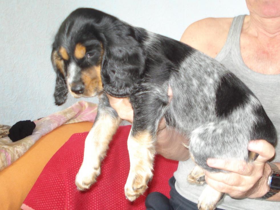 4. Кобель Черно -пегий в крапе с подпалом. Выбран.