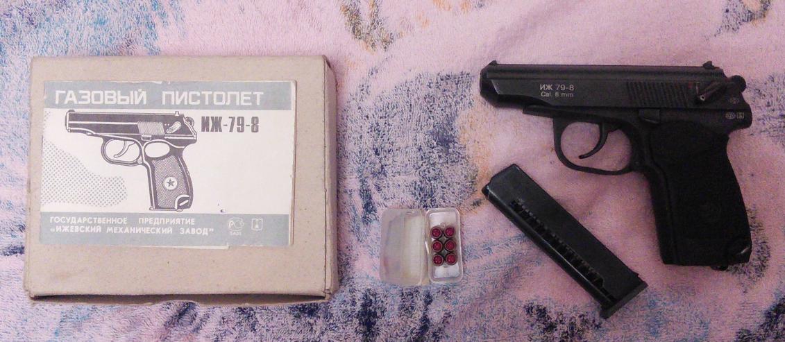 3) ИЖ-79-8 газовый, 8мм, 1997г. Состояние - надо почистить от пыли и смазать, пистолет совершенно не использовался, настрел лично мой - 4 выстрела, возможно до меня было сделано еще не больше 10 шт. В комплекте - магазин и коробочка =). Цена пусть будет 5 000 р., либо предлагайте свою с аргументами, возможен торг