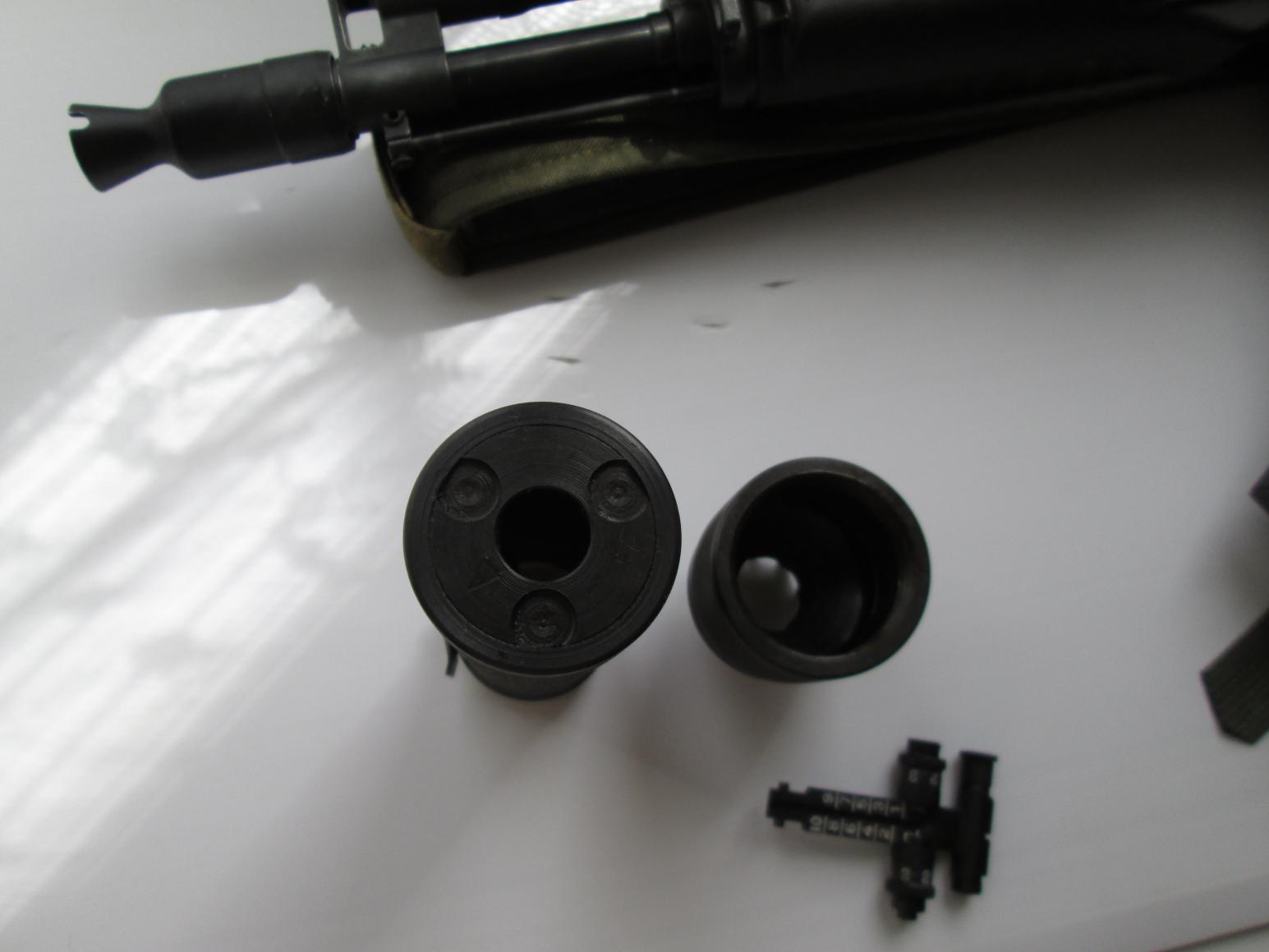 Установлена настоящая газоотводная трубка с накладкой слива, цевьё слива. Кольцо цевья с антабкой. В комплекте родные чёрные. Приклад такой стоял, не знаю от чего он. Откидывается в право, если ставить муляж оптики то очень удобно. В комплекте муляж ПБС-1 изготовлен из металла , планка для ПБС-1 настоящая. Колодка мушки, шомпол и ствол всё прикручено доп. винтами. Всё собрано без люфтов, ни где не чего не болтается.