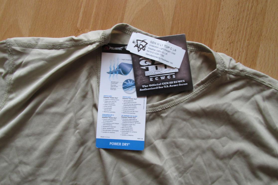 Слой 1. Представляет из себя комплект футболки с длинным рукавом и кальсон, цвет десерт санд. Задача этого слоя состоит только в отведении пота на следующие слои, таким образом этот слой не согревающий а только потоотводящий. Комплект выполнен из PolartecR Power DryR. Размер комплекта таким образом подбирается так чтобы был максимально обтягивающим. Вырез на футболке О образный, на рукавах имеются отверстия для больших пальцев рук. По тактильным ощущения материал очень приятный к телу, напоминает шелк. При примерки и фотографировании при температуре окружающего воздуха в 25 градусов по ощущениям в 1ом слое прохладнее чем без него. Вес 320 грамм