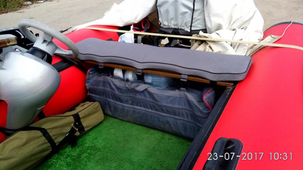 Полы, морская фанера. Выпуск лодки - 04.2015, покупка - 08.2015, спуск на воду - 05.2016, общее время на воде - 27 м/часов. Комплектация всё, что идёт по паспорту + Носовой тент, носовая сумка, дополнительные широкие банки с мягкими накладками, коврик, БРОНЬ ВСЕГО ДНИЩА !!!. Есть одна латка, в носу, внутри, на фото обведено белым кружком. Состояние отличное. Цена: 78000. Причина продажи - переход на пластик.