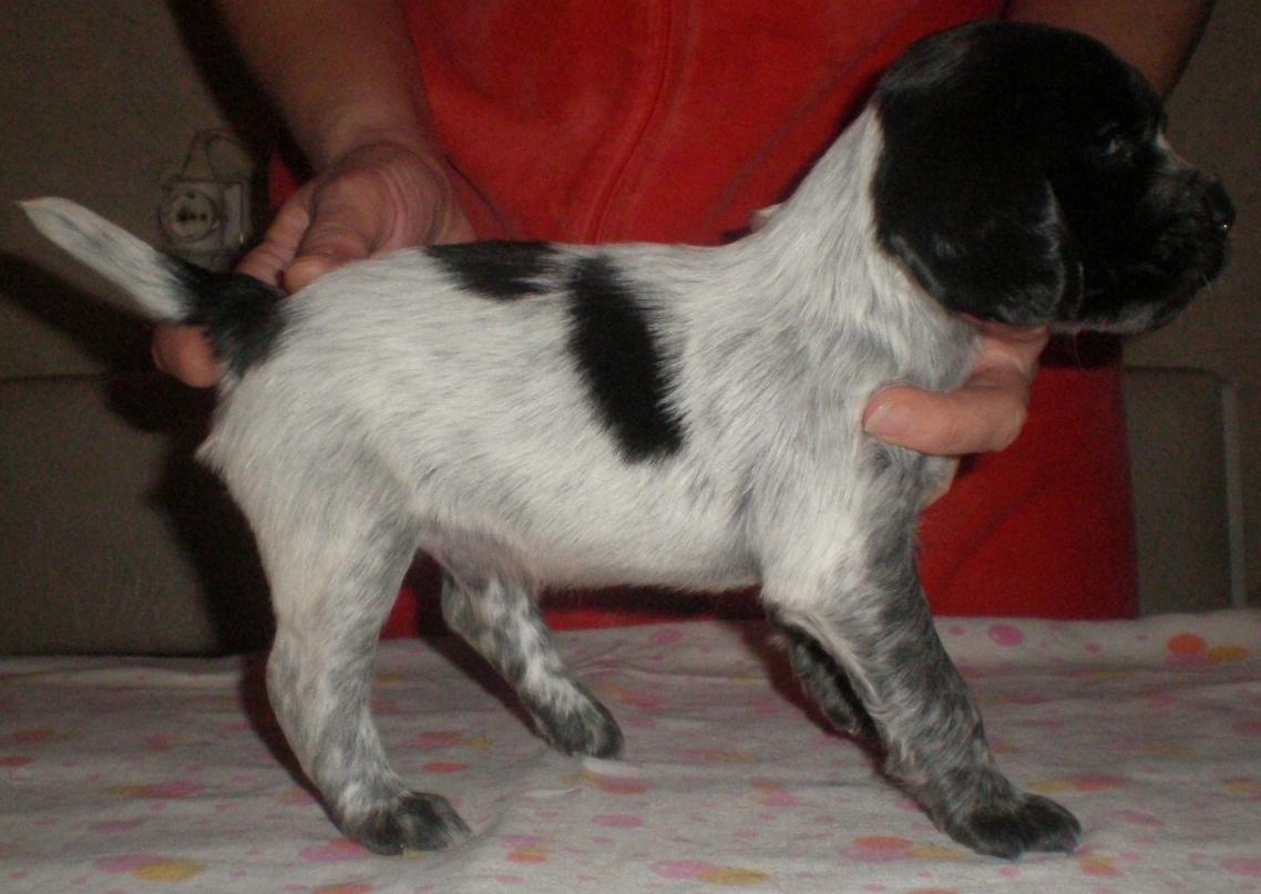 Он белый с черным и есть еще трех цветка, остальные черно-пегие. Три суки и четыре кобелька.