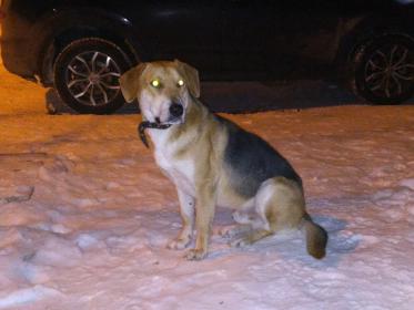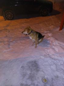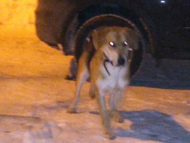 Увидел торчащие ребра - предположил, что пёс изголодал. Очень боится резких движений. Как минимум уже неделю он бегает по нашей улице.