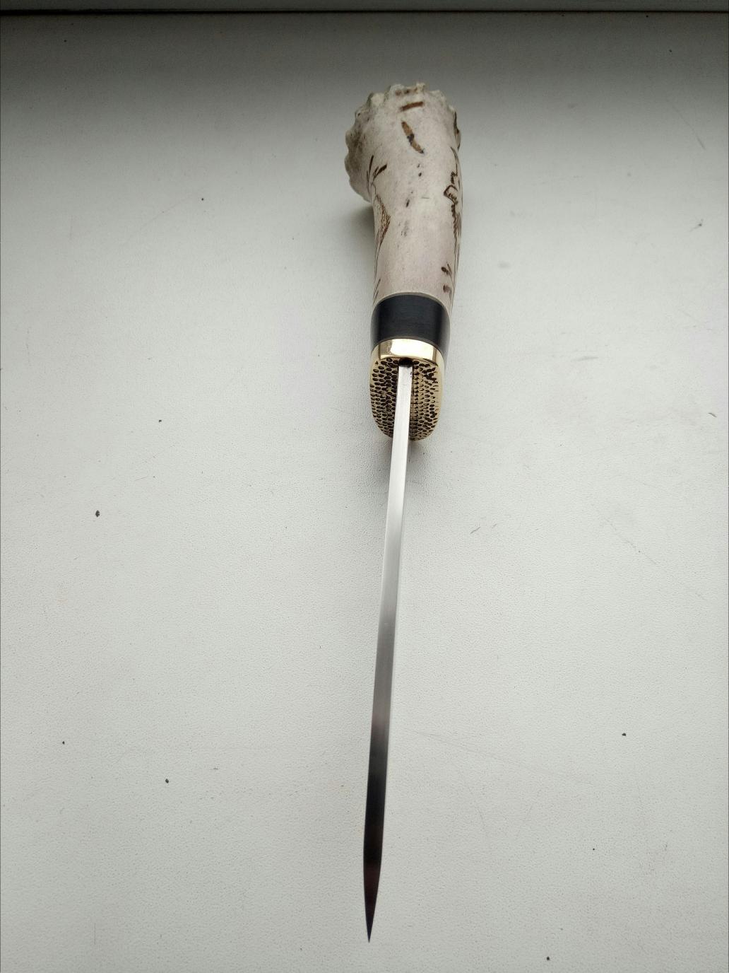 Рукоять: Рог лося с резьбой головы кабана на тыльнике и пирографией на рукояти. Проставка - африканское черное дерево (african blackwood) - Dalbergia melanoxylon.