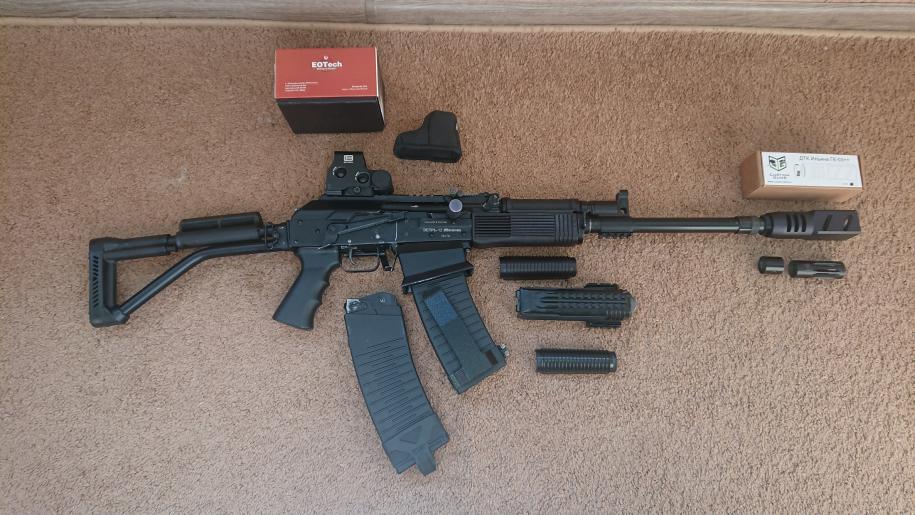 Продам вепрь ВПО 205-00. Ствол 430 мм. Выпуск 2014 года, я второй владелец. Все притёрто, пристреляно. С получёком и ДТК стабильно переваривает навеску 24 грамма. Настрел около 200 выстрелов у первого хозяина и 400 выстрелов у меня. В комплекте само ружьё, штатный пламегаситель, штатная гайка защиты резьбы, 2 магазина по восемь мест, брезентовый чехол для транспортировки и нижеперечисленные допы.