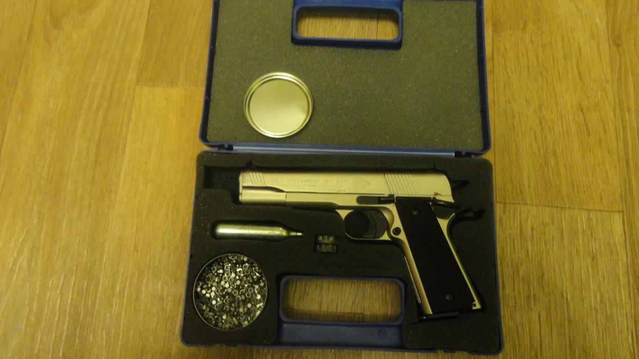 1. Umarex Colt 1911 в никеле. Самовзводом стреляет четко, с предварительного взвода иногда курок сам срывается. Автоматический предохранитель в рукояти упразднен, курок нарощен болтиком.
