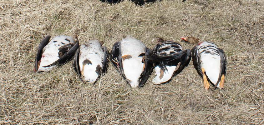 Открытие. Результат утренней зорьки: 5 гуменников + 1 белолобый. Гусь летел до 12 часов большими косяками с юга на север. Его, можно сказать, было "море". Но немного подвела погода. Гусь весь летел под небесами.