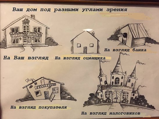 Так картинки "На ваш взгляд" и "На взгляд покупателя" очень точно нарисованы. Очень веселит система ценообразования, если автор строил свое жилище всю свою жизнь из всего, что смог достать (из чего попало и как попало, в силу своих инженерных способностей) и тратил на него все свои сбережения, то сооружение непонятной формы и замысловатой планировки из постепенно прираставших закутков при продаже должно покрыть все его финансовые, физические и моральные траты с избытком!