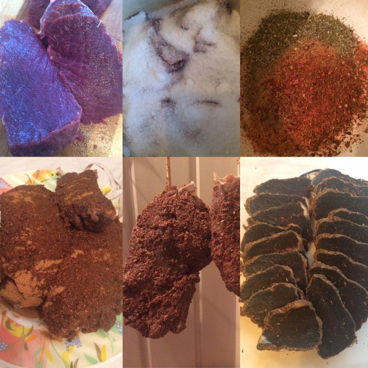 Чего то тема стала падать... Короче, я тут насмотрелся на товарищей и решил состряпать бастурму. Мясо лось. Кусок разморозил и засолил на 3 суток, периодически сливая воду и добавляя соли. После вытащил из соли и замочил в воде проточной, целых 12 часов. Купил смесей разных (в этом была ошибка), перемудрил и специй разных много намешал (сухих надо меньше или вообще не надо)... ну намазал и выдержал несколько минут, вывесил мясо на балконе. За 1,5 недели мясо стало подсушеным, через 2 сухим. Счистил приправы эти и с пивом отпробовал, потом с сухим вином... Не очень получилось, почему то недосоленое (показалось) и специй поострее не достаточно... но теперь подойду более внимательно к этому чудо-блюду. Фото: