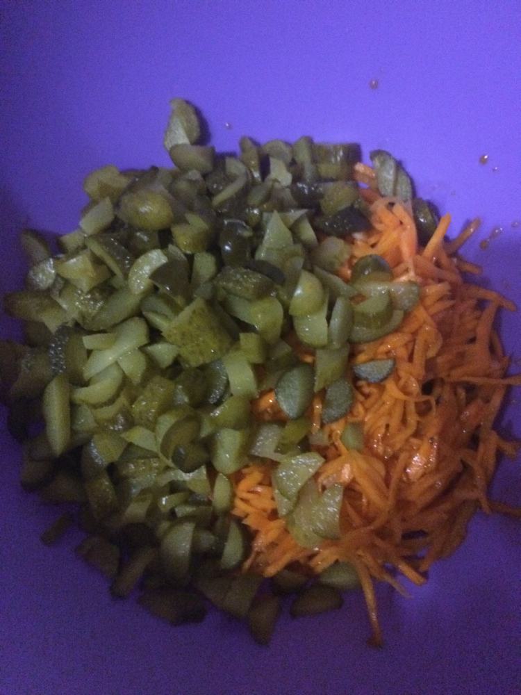 Чуть не забыл... Итак нашел я пару языков косули с прошлого года в морозилке... Интернет курил, но кроме заливного мало кто, что готовит, по совету товарища решил впервые! приготовить салат. "Обжорка из языков косули": язык отварил 1.5 часа в соленой и поперченой воде. Под холодную воду и почистил пленку.Далее натер свежую морковь и нарезал лук (репчатый), обжарил на подсолнечном масле. Добавил корнешены маринованные и морковь по корейски. Можно кушать с майонезом, а можно с оливковым маслом - все очень вкусно и разнообразие опять же... Приятного аппетита коллеги!