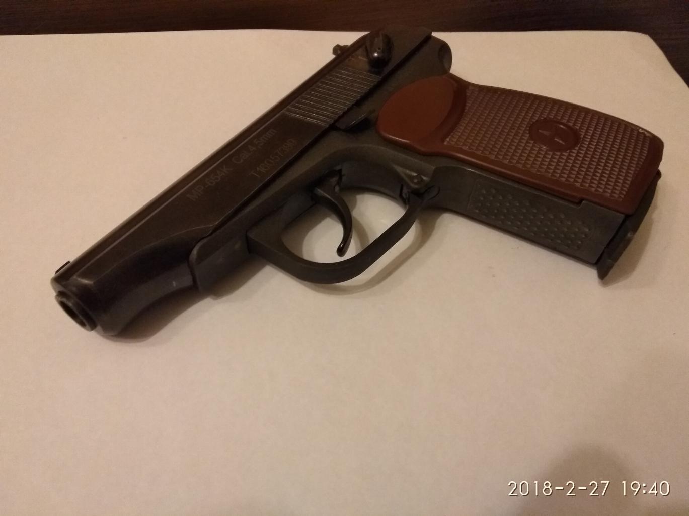 Здравствуйте! Продам МР 654к 20 серия. Состояние хорошее, стреляет отлично, клапан не травит, есть незначительные потёртости. Пистолет хранился дома, не ржавый. Цена 3500 руб. без торга.