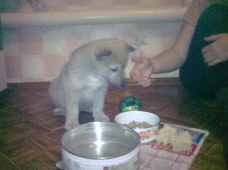 Василий31,на будущее-никогда не корми собаку с пола а всегда ставь миски с едой и водой на подставку.По мере роста щенка высоту подставки увеличивай.