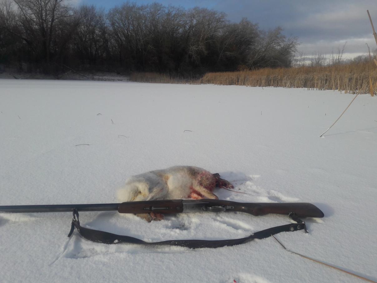 Поначалу ничего не обычного, приехали, на озимях взяли следок ведущий в пашню, ну пошли тропить, петли, сдвойки, скидки всё как всегда. Косой напетлял в диаметре метров 100 ужас сколько, замучался распутывать, напарники по бокам мониторили обстановку. Понимаю что косой где то совсем рядом и наблюдает за нами, то и дело подымаю голову осматриваюсь, удивляюсь почему не встает, вижу вторую покопку (готовиться лечь), точно рядом, почему не встаёт?!, начинаю подымать голову на напарника находящегося справа метрах в 30, взгляд выхватывает косого лежащего от меня в метре и подрывающегося в этот момент, в голове мелькает мысль:" ну всё, взял". Бъю метров с 10-13, от выстрела то ли всплеск земли, то ли разрыв земляной глыбы, зая продолжает улепётывать, я в изумлении даю больше упреждение бъю метров с 25, хера- бежит. Напарник видевший вставшего от меня в метре зайца и не собиравшийся стрелять в уверенности, что я его возьму начинает стрелять метров с 50 по косому, но тот по меже, пригнувшись, что видно только уши улепетывал от нас. Проводив взглядом зайца до конца поля метров 300, пошли смотреть, что на следу. Чёс шерсти чуть, чуть и маааленькая капелька крови да же не каждом прыжке, дававшая уверенность понять, что чуть раненый зай скорее всего будет добран лисой ночью. Постояв подумав решаем пройти по следу, дойдя до конца пашни зай сбавил ход, но крови больше на следу не стало, ход следа был уверенный. Вернулись к машине, попили чайку, прошло минут 40 решаем тропить этого зайца. Подъехав и вернувшись к тому месту где бросили след прошли по уверенному следу метров 150 и ......барабанная дробь, подобрали уже почти окоченевшего косого. Осмотр показал, одно дробовое ранение на передней дальней от стрелка лапе (второй выстрел) и отсутствие шерсти на брюхе размером с пятирублёвку без проникающих ранений (первый выстрел). Поднявшийся ветер и метель закончили нашу охоту. Разделав зайца обнаружил разбитую печень, вся кровь в брюшине. То ли нераскрывшимся контейнером вскользь по брюху попал, то ли мерзлым куском земли от выстрела ему прилетело. Получается, что зай к нашему выходу из пашни по его следу уже был готовенький и ждал нас, а мы чуть чуть его не просохатили. О как бывает. В связи с последними событиями, кажись на предпоследней охоте косого оставил на карычей, не пошёл я после стрела за ним, хорошо он убегал, а бил ведь почти наверняка.
