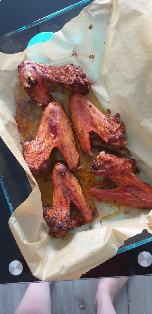 Фото какое-то не ахти вышло, не аппетитное, но на вкус не повлияло) Куриные крылья в сливочно-чесночном соусе. Утиные шеи мариновались в бальзамическом уксусе, приправе масала и горчице. В итоге взял на заметку готовить по отдельности, да и шеи индейки более интересны по количеству мяса. Так же шеи мальца подсушились, а крылья из-за сливочного соуса не пришпарились корочкой. Ну или нужно на разных противнях - крылья выше к грилю, шеи ниже. |