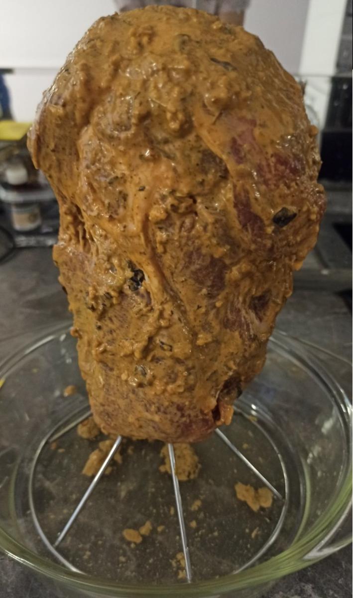 Пожарить стейками супруга нос воротила, а я не хотел в духовке, т.к. уже приелось) И тут мой взгляд зацепился за приспособление, на котором курицу целиком жарят, как гриль. Ну и понеслась душа в рай!) Прикинул, надрезал, замариновал как полагается и надел чулком на стойку да в духовку. Промариновалось очень хорошо! Да еще с пюрешкой и домашним лечо. Уплетала да же дочка, хоть к мясу и равнодушна.