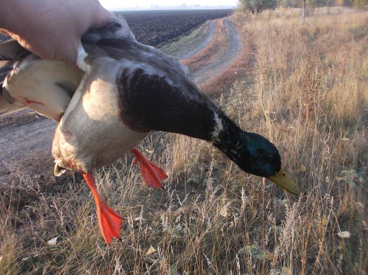 Приехал в угодья с рассветом. Туманище. Машина показала что за бортом О градусов. Свежо. Слепил первого подранка в этом сезоне. Вроде бы и попал хорошо, утя завалившись на бок плюхнулась в воду с 10 метровой высоты. Но падая сразу же и нырнула. И пропала. Глубина с метр. Я всё дно перерыл в диаметре 3-4 метров. И проверил камыш напротив , но всё бесполезно. А в бобровом ручье поднял штук 15 крякашей и первым же выстрелом выбрав селезня добыл трофей. Почему то опять стрелять по остальным не стал, хотя возможность была. Опять сработал внутренний тормоз- смотрю только на сбитого. Упал селезень в траву, так что пришлось опять поволноваться что отыщу. Но в этот раз фортуна была за меня. Потоптавшись минуты 3 на 10 квадратных метрах я заметил торчащее сломанное крыло из под травы. Взял кряка в плен. Но осмотрев его получше увидел пробоину в бочине -пришлось добить. Утка пошла уже без костышек и с жирком , хотя в желудке только ряска и песок.