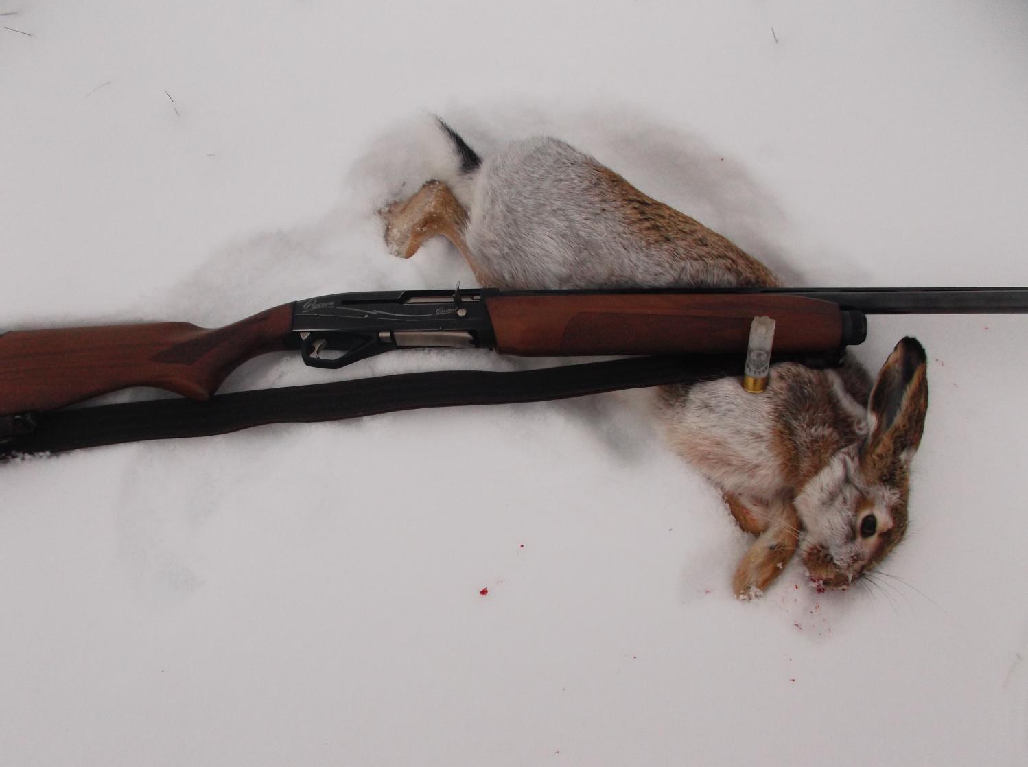 Съездил сегодня к брату в БГ район. Вышли уже к обеду. Через 2 часа безрезультатных хождений брат послал меня и всех зайцев к энтой матери и остался на речке греться у разведённого костра. А я пошёл дальше искать ушастиков. Два раза дотропил до вчерашних лёжек. Следы не различить что когда было. Но зайца я всё таки добыл. Заяц явно перемудрил. Лежал он за пастушечьим шалашом около одинокого карагача в степи. Я по следу прошёл мимо этого шалаша метрах в 6-8, а он похоже решил меня пропустить. Я уйдя метров на 30 решил вернуться и подошёл к шалашу на 10 метров . И тут зая срывается с лёжки и выбегает прямо передо мной. Хотя мог бежать в любую другую сторону и остаться невредимым. Но видно такая судьба у него. 20 метров и один патрон Феттер№2 остановили зайца навсегда. Звоню брату и говорю- Вписывай себе в путёвку зайца. Естественно братан сделал заключение ,что зайца я добыл совершенно случайно. А я и спорить не стал, лишь сказал ему- С полем.