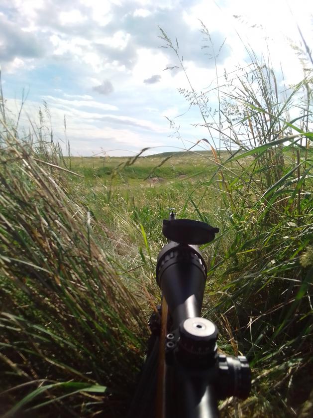 И тут вылезла моя ошибка по неопытности. Как только взошло солнце, то оказалось что оно светит мне прямо в оптику. Стрелять оказалось совершенно невозможно. Снимаюсь с места, осматриваюсь и оказывается что ровно на 180° есть сурчина с вполне себе нормальным сурком. Один минус - в точке с которой я могу выстрелить очень большой наклон. Пришлось ложиться под 90 градусов к карабину, а правую сошку делать на два щелчка короче левой.