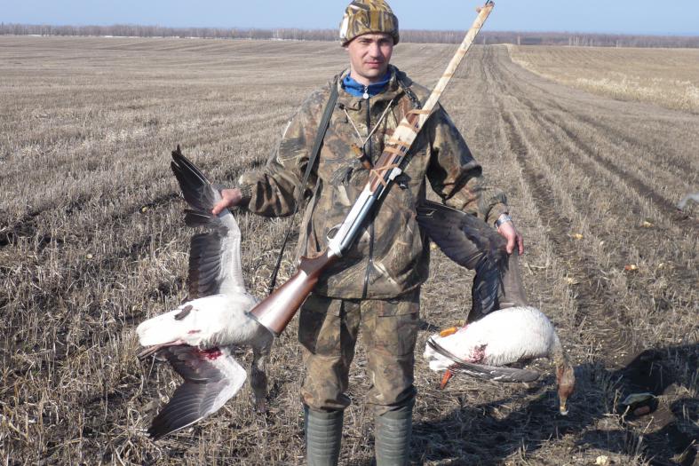 Весна,весна-весна-весна, как много несёт в себе это слово. Тепло, любовь, жизнь в конце концов! И моя 31я весна много чего мне приготовила, как в быту, так и на охоте… В этот год для весенней охоты у меня мало времени заложено. Но темнее менее, выезды будут. Вот состоялся выезд по гусю. Я вообще сторонник индивидуальных охот весной, да и в принципе правила охоты к этому склоняют. Собрался я как всегда, ещё зимой! Весна пришла неожиданно, да сразу с солнцем и резким +20. Так что, даже машину не испачкал. Выехали на место, куда ехать долго голову и не ломал я. Выбрал поле, решили сесть в кикиморах, ну его, окоп копать, пусть дураки копают Разбили лагерь. Костерок, казан, по сто грамм горькой. Друг приготовил отменный плов, ещё по сто, за это! Травили байки, и перебил нас завораживающий гогот виновника нашей встречи. Гусь прошел над головами, в груди защемило… Вот он красавец, прошептал я. Утренний подъем! Чай и в поле, ребята в болото на селеха, мы с другом на профеля. Сели в траву, в маскхалатах, нам «казалось» мы просто не заметны… J Пошли часы ожидания. Слышишь? Гусь вдалеке курлычит… Да, слышу, и вижу стаю в бинокль , далеко лапчатые. Потом гусь повалил дуром просто, мы манили и манили. Гуси и нас вниманием не обделили, наступила пауза у них, обычно говорят в этих случаях: Затишье перед бурей. Я встал размять ноги, и рассматриваю окрестности в бинокль, а неподалеку у наших профилей, в поле лужа, в 100метрах где-то, ну я виду биноклем по горизонту, хоп! В круглых экранах чё-то промелькнуло, я возвращаю чуть левее и доли секунды замечаю что-то! Это были птицы, голов 8-10, мне, почему то показалось, что это стайка утей. Говорю товарищу: короче, хрен с ними с гусями, вон стаю утей села в лужу, да ладно! Серьёзно. Давай, мордой в землю и поползли… Только я подумал медленно сесть и ползти, Как утки взлетели и закурлыкали как гуси, удалились прочь! Вот тебе и утки… Начали манить, от стайки отделился один гусь, и вернулся, он дал около 10 кругов над нами, один раз был на выстреле, но чё-то думалось, что сядет, стрелять не стали. Он сел на лужу, побыл на ней, где-то 10 сек и улетел. Думаю, он нас не только видел, но и какнул на нас сверху! Так как, не копатели дураки, а мы! Всю жизнь копали и лучше маскировки не придумать. А мы два фраера, укрылись, типа самые умные. Всё! Я решил, еду на следующий день, переношу профиля к луже и частично в лужу, копаю окоп, сажусь рано утром! Так и поступил. Сел в окоп, начало светать, тишина, красота! Вдалеке кричали аисты, такое ощущение, будто я в каком-то заповеднике нахожусь, вспомнил Воронежское детство, так как у нас в деревне каждую весну на столбе селился аист. Эх, хорошо, пробормотал я. Уже солнце вышло, а гуся нет. Блин, неужели не свезет как вчера? Вылез из окопа, стаю вслушиваюсь. Слышу! Слышу, запрыгнул в окоп укрылся, начал манить в манок из латунных гильз. Всё ближе и ближе звук, кручу головой, где вы? Где выыы? Вижу! Маленькая стайка идёт в моём направлении голов 7-8, всё вижу их четко, я начал суетится и изредка фальшивить в манок, дышать не могу всё сжало, сердце выскакивает, мышцы все сжались. Слышу чётко, они запрашивают посадку гы-гы-гы------гы-гы я отвечаю звуком похожим на клее-клё-клё кле клее. Они в ответ, я им. Они выходят мне в лоб, думаю: хер я Вас буду осаживать! Есть шанс, бери! Скидываю накидку с окопа, Бах! Слышу удар о землю, ружьё практически вертикально Ба