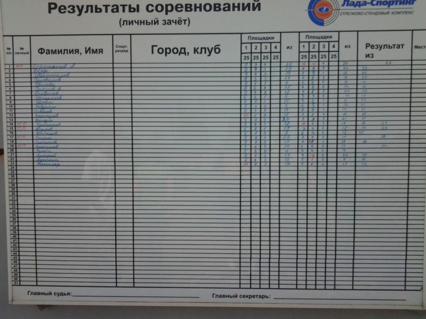 Призовые места распределились следующим образом: группа "охотники" 1 место - Колодин С. с результатом 41 из 50 за 2-е и 3-е место была перестрелка среди троих участников, которые поразили одинаковое количество мишеней - 39 из 50. 2 место - Карнаухов Н. с результатом 39 из 50 и в перестрелке 15 из 25 в перестрелке двое участников поразили одинаковое количество мишеней 13 из 25, и за 3-е место была дополнительная перестрелка до первого промаха. 3 место - Дерр И. с результатом 39 из 50 и в перестрелке 13 из 25 группа "спортсмены" 1 место - Струженков А. с результатом 80 из 100 2 место - Спирин Д. с результатом 78 из 100 3 место Гребешков Ю. с результатом ___ из 100 |
