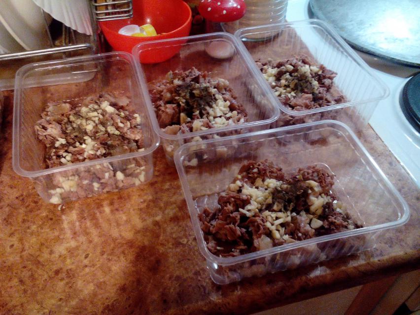 Продолжение. Чеснок режу, ни каких давилок не признаю. Бульон на балкон, жир поднимаеться на верх в виде белой корки, снимаю его шумовкой. И ни каких проблем. Ставлю бульон на комфорку, кидаю лук, морковь ну и вариться он с часик. Тем временем раскладываю по одноразовым судкам мясо, чайную ложку с горкой чеснока, перца черного молотого. Кипящим бульоном заливаю и на балкон. Морковь в холодец не кладу, выкидываю вместе с луком. Как то так. Оптимальные судки 750 гр, но в этот раз чет не было, пришлось брать по литру. 12 судков вышло. Казан 8 л, кастрюля 5 л. Ну как то так. Да, варю под крышкой. Процесс снятия жира и заливки бульоном не фотографировал. Употреблять с горчицей, у меня мама ее хорошо делает, магазинная рядом не валялась.