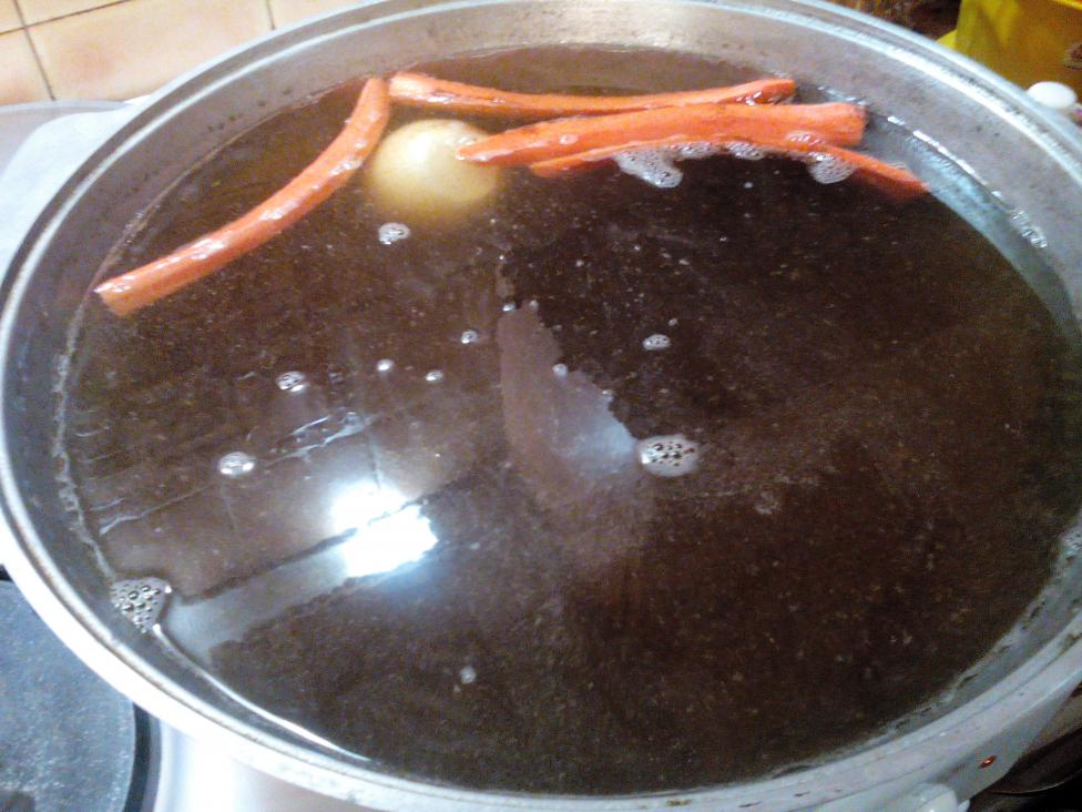 2. После варки (чайная ложка соли, средний огонь, снятие пены) в течении часа бульон весь сливаю. Зачем сливать? Дальше и позже объясню я или помогут. Мозговые косточки вытрясаю, содержимое присаливаю, наливаю - употребил, закусил (готовить вообще надо всегда в хорошем расположении духа и организма )