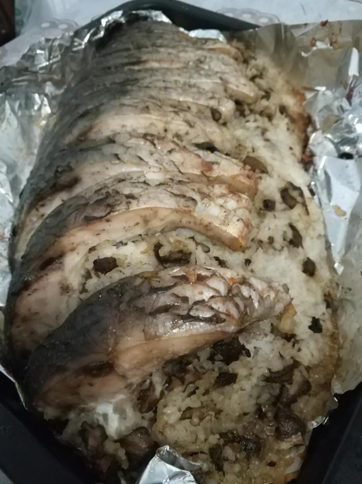 Сазана привезли к НГ друзья, угостили! Решил особенное изобразить, т.к. рыбина была большая, килограмма 3-4. Голова и хвост с плавниками в уху. Икру приготовил по простому (вычитал) - обжарил с яйцом куриным, укропом и солью с перцем и на бутерброды! Сазана же напичкал специальным составом - рис с грибами (отварить/обжарить), на 40 минут в духовку вместе с рыбой! Ум отЪешь!!!