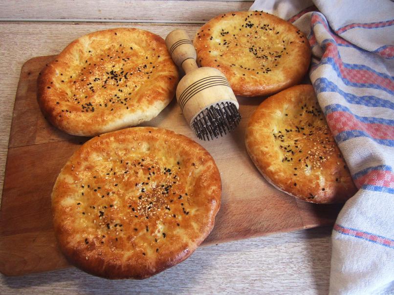450гр. муки 300мл. тёплой воды 1ч/л соли 1ч/л сухих дрожжей 1ч/л сахару Желток одного яйца 1ч/л кунжута 1ч/л нигеллы (чёрный такой "брат-кунжут", он-же сейдона) Дрожжи с сахаром залить половиной воды, тщательно размешать, поставить на "булькотение". Сразу после этого: просеять муку над ёмкостью, в которой замешивать. Добавить в неё соль. Перемешать венчиком. Влить остатки воды в дрожжевой стартер, он к этому времени должен уже "забулькотить", потом всё в тесто и пять минут его вымешивать. Ровно. Оно за пять минут перестанет липнуть к рукам. Оставить в ёмкости, накрыть кухонным полотенцем, крышкой, завести таймер на 40 минут и уйти вдаль. Через 40 минут обмять восставшее тесто и оставить его ещё на 20 минут. Итого: час ничегонеделанья - на подъём. Зажечь духовный шкаф на полную, если газ, а если электро - на 250 градусей. Пока он греется - тесто обмять последний раз, пару раз плюхнуть об стол и разделить на четыре шарика. Сыпануть шушуть муки на стол. Шарик об стол шлёп, кулаком в центр шлёп, и растягиваем лепёшк. Тыр-пыр, триста дыр - если есть чекич. Если нету - вилкой потыкайте. Это нужно, чтобы центр лепёшки больше не поднимался. Четыре штуки сделали? Желток тщательно размешать и кисточкой нанести равномерно на лепёшки. Посыпать кунжутом и нигеллой, выложить на противень (без масла, муки снизу на лепёшках - достаточно), и отправить на царствие в духовный шкаф. Ровно на 20 минут. И опять уйти вдаль. Как запищит таймер - достать, выложить на доску, побрызгать водой, накрыть кухонным полотенцем, оставить остывать. Всего дел: 10-15 минут конкретных действий, час на подъём дрожжей и 20 минут духовки. Кароч - ни о чём. Зато вкусно и здорово. И вкусно ещё :-)