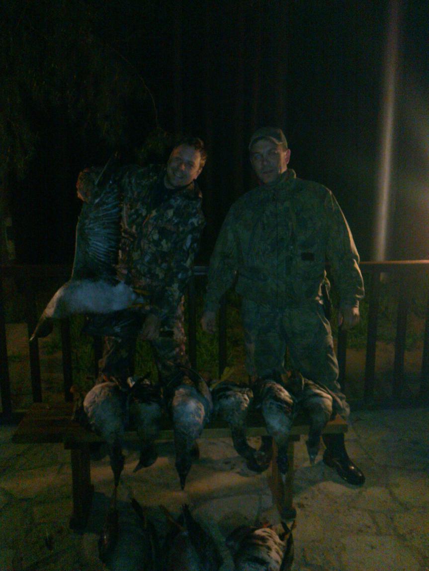 Всем привет. Все-таки догнал я своего гуся , который на меня "ХЫТРО смотрел" в Кировской области. Был там в начале мая в командировке, товарищ предложил на денек задержаться, организовал охоту. Охота очень своеобразная, совсем не как у нас, до места шли на моторке часа полтора перелетая небольшие куски суши, кустов, топляков и прочего. Преодолев последний порог, выехали на разлив Вятки в лугах. Красотища: кругом вода, море-океан ) Практически сразу услышали гусей на воде. Пока перекусили, да по 100 боевых, гуси поднялись дружно и ушли на кормежку, оставив нам на растерзание одного подранка. Мы в это время на позиции, я и один из моих товарищей на лодках да по кустам в 500 метрах друг от друга, а остальные втроем на моторке тоже примерно на таком расстоянии от нас, треугольником короче. Прошло часа полтора, намека на то, что гуси вернуться даже не было, ни разведчиков, ни далеких стай. Прошло еще полчаса и началось такоооое!!!!!!: со всех сторон, одиночки, пары, стаи штук до 30. Вот сколько глаз видит - со всех сторон. Но, надо отдать должное, бдительность они тоже не потеряли и поэтому на выстрел долетали только единицы. Война стояла с полчаса, когда почти стемнело гуси садились не стисняясь в 100-200 метрах, почти не обращая на выстрелы. В целом все было очень похоже на открытие утиной осенью в каком-нить хорошем охотхозяйстве. Результат данного мероприятия следующий: 6 белолобых (включая подранка, которого добрали вначале охоты) и 6 гуменников, причем 4 из них были невероятно больших размеров. Всё, закрылся, успокоился!!!
