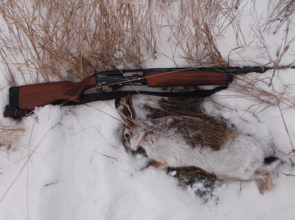 Прибыл в угодья сегодня с рассветом. Думал что после ясной ночи следов будет полно. Но всё оказалось не так просто. Только через 2 часа нашёл первый свежий след. Стал тропить , но через пару км заяц привёл меня в приличный лесок. А я уже зарекался , что больше по лесам за зайцами гоняться не буду. Бестолковое это занятие. Развернулся и пошёл в другие места охотничье счастье искать. И нашёл. Следы выходили из овражка поросшего камышом. По полю он пожировал не особо далеко и обратно спустился в овраг. Но заяц оказался толи слепой толи глухой. Я по следу подошёл к краю оврага, прошёлся в одну сторону метров 15 , затем в другую. Меня он видел и слышал по любому. Но подниматься не хочет. Пришлось спуститься. Нашёл его лёжку , а зайца нет. Я сделал шагов 5 вдоль камыша, и только тогда заяц дал о себе знать. Пробежав по камышам метров 15 он начал выбираться из оврага. Я вскидываюсь в его сторону и вижу зайца уже на вершине оврага. Полсекунды наверное было у меня что бы выстрелить. Бух и заяц начал медленно скатываться назад в овраг. Патрон опять Феттер№2 и что хорошо опять самец.